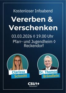Die CSU, Ortsverband Reckendorf, ist Gastgeber für einen Vortrag zum Thema „ Vererben und Verschenken “ am Dienstag, den 03.03.2026 um 19.00 Uhr imPfarr- & Jugendheim, Pfarrgasse 6.